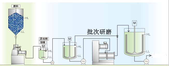 因材料研磨要求的不同,針對不同類型的材料、溶劑、粒度要求,一般采用通過式研磨、循環式研磨、間歇式研磨、A/B式研磨、串聯式研磨等